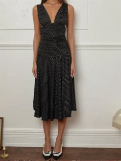 Women’s Tank Dress Stylish Dot Print Pleated Waist Sleeveless V Neck A Line Dress for Spring & Summer